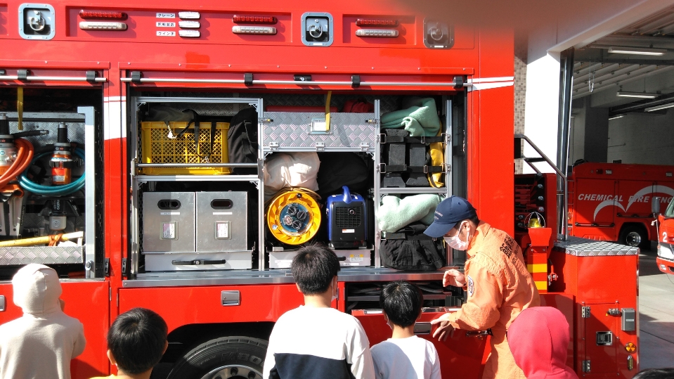 消防署見学に行きみんなで放水体験や車内の見学をしました。